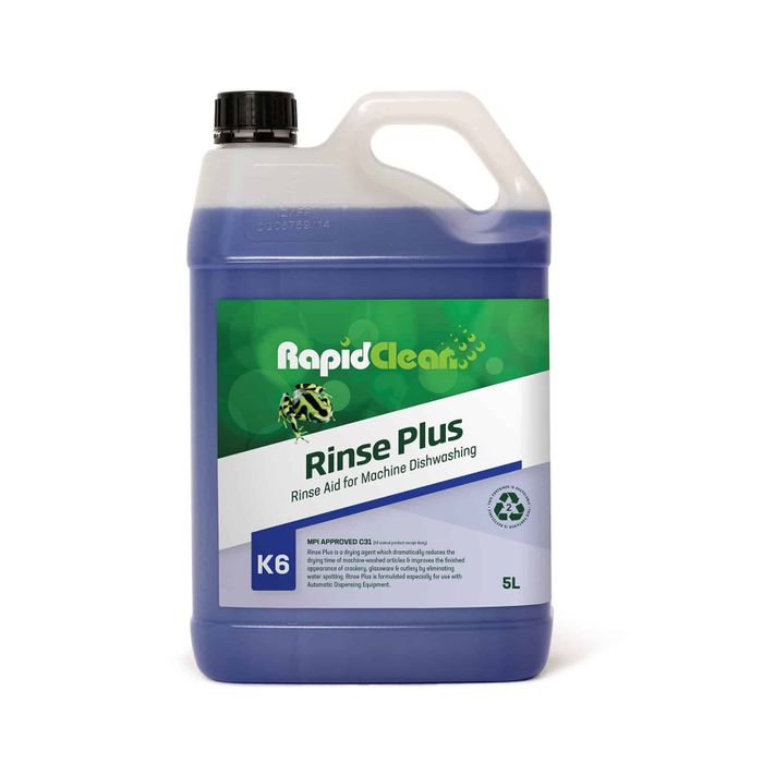 RapidClean Rinse Plus Machine Dishwashing Rinse Aid is a drying agent which dramatically reduces the drying time of machine washed articles and improves the finished appearance of crockery, glassware and cutlery by eliminating water spotting. Rinse Plus is formulated especially for use with Automatic Dispensing Equipment.