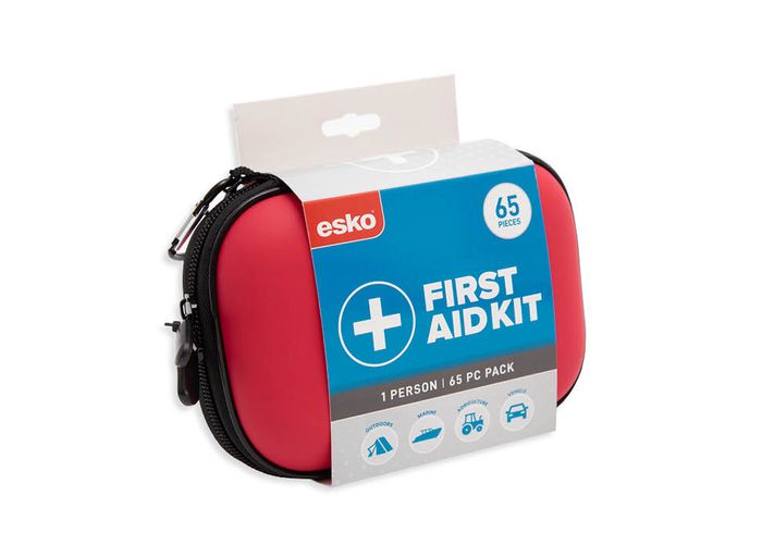 Tools: 1 x rescue whistle, 1 x stainless steel tweezer, 1 x scissors, 1 x thermal rescue blanket, 2 x splinter probes, 1 x CPR mouth shield, 1 x first aid guide Clean: 6 x non-alcoholic cleansing wipes, 2 antiseptic towelettes Treat: 2 x sting relief prep pads Protect: 1 x disposable nitrile gloves (pair), 10 x adhesive dressing strips (7.5cm x 2cm), 10 x adhesive butterfly bandages, 15 x adhesive bandages (4cm x 1cm), 1 x triangular bandage with pins (2), 1 x gauze roll (5m x 4.5cm), 1 sterile pad (22cm x 12cm), 2 x sterile gauze pads (7.5cm x 7.5cm), 4 x sterile gauze pads (5cm x 5cm), 2 x adhesive tape rolls