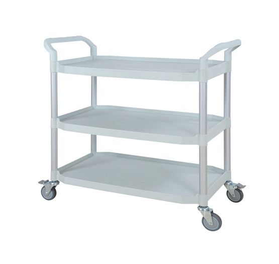 Large shelves hold various equipment and supplies. Attractive styling. Smooth, easy-to-clean shelves. Large, non-marking castors (two braking). Hygienic plastic moulded shelves. High quality.