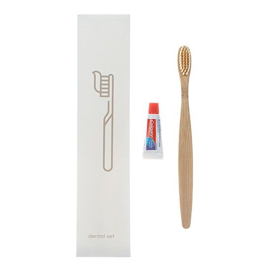 Colgate tooth paste and premium soft bristle combine with a sustainable bamboo brush. Oral hygiene in a sachet. Instead of cutting down trees for paper or making the packaging from a number of kinds of plastic, we are choosing to use an innovative material called Rockstock. Rock stock is made from 80% Calcium Carbonate in the form of quarry waste. And best of all it's waterproof so no more water damaged unopened products.
